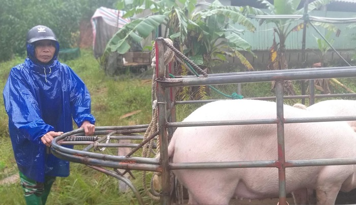 Chị Nguyễn Thị Thủy ở xóm 7, xã Cẩm Duệ đang chở đàn lợn đến nơi an toàn tránh lũ. (Ảnh: Phan Ấn)
