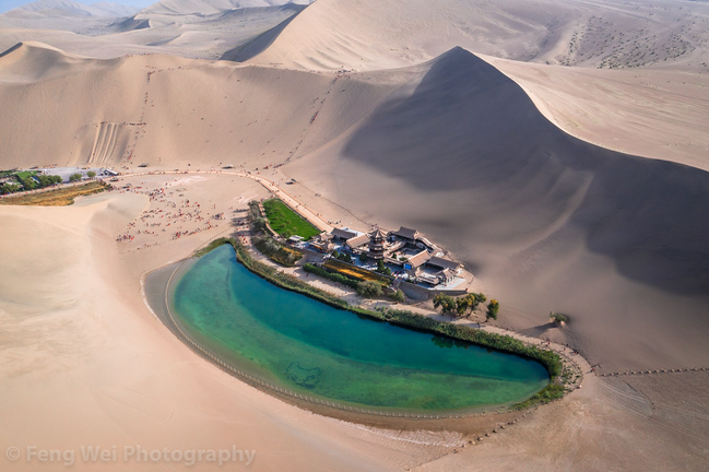 Cảnh quan ở đây đẹp như tranh vẽ, khi nhìn từ trên cao nhìn xuống ốc đảo hình mặt trăng như đang rơi xuống sa mạc.