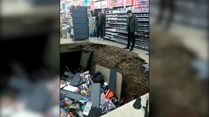 Mặt sàn trong siêu thị mới khai trương tại Hà Nam, Trung Quốc bất ngờ sụp xuống tạo ra một hố lớn “nuốt chửng” 2 người và hàng hóa.