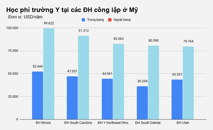 Trong đó, học phí tại trường Y ĐH Illinois lên đến 99.622 USD với sinh viên bang khác và 52,444 USD với sinh viên trong bang. Con số tương ứng tại trường Y ĐH South Carolina là 91.313 USD và 47.051 USD.