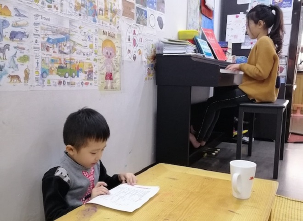 Hai bé con nhà chị Giang tự học trong những ngày nghỉ ở nhà. (Ảnh:V.N).