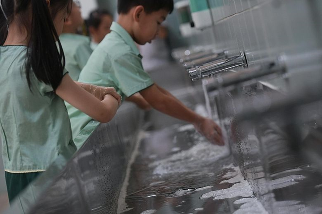 Học sinh Singapore rửa tay sạch sẽ trước khi vào lớp. (Ảnh: ST)