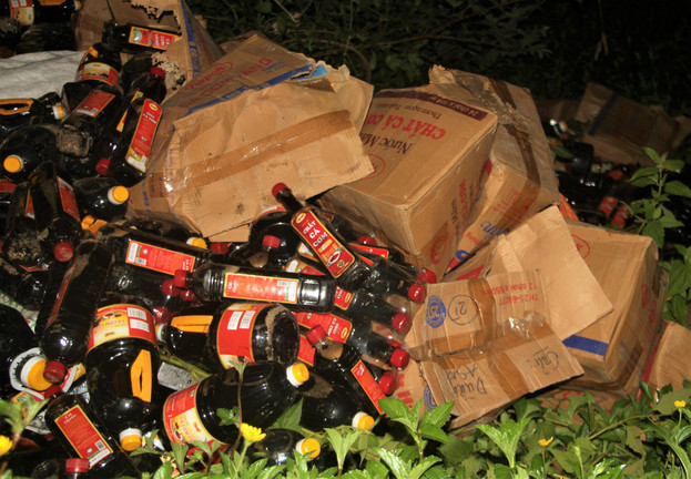 Hơn 1.000 chai nước mắm bị vứt trong bụi rậm. ( Ảnh: P.N)
