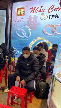 Trong ngày vía thần Tài, nhiều người đội mưa phùn, ngồi xếp hàng chờ mua vàng từ khi trời còn chưa sáng.