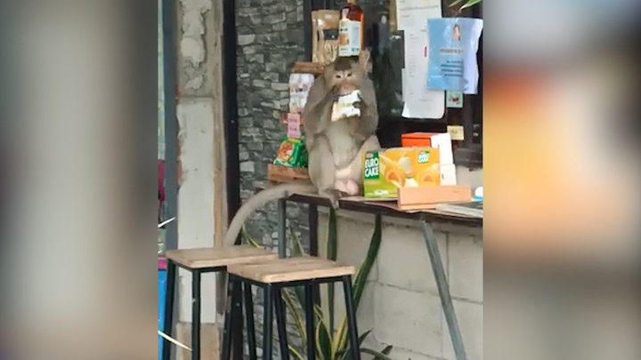 Đàn khỉ hoang đột nhập vào quán cà phê tại Thái Lan để trộm thức ăn, chúng đã lấy những chiếc bánh ở quầy và sau đó rời đi.