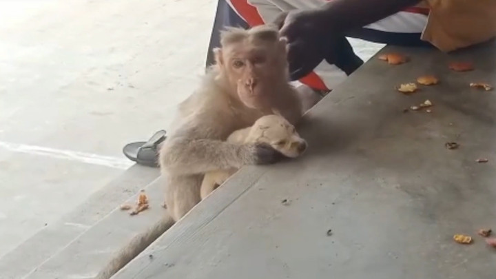 Một con khỉ hoang tại bang Tamil Nadu, Ấn Độ luôn bế chú chó con theo mình, không cho ai đến gần và chăm sóc chó như con đẻ của mình.
