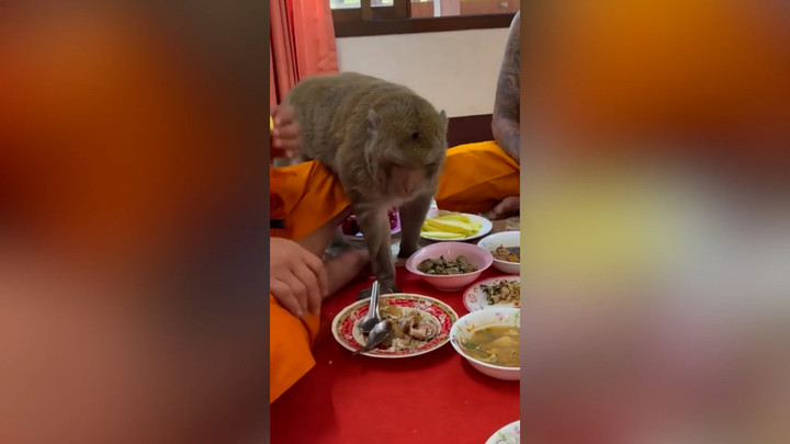 Các nhà sư ở Thái Lan đang dùng bữa trưa, một chú khỉ táo bạo xông vào bàn tiệc để xin ăn, đến khi đạt được mục đích con vật mới chịu rời đi.