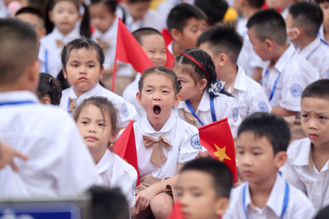 Thức dậy từ sớm chuẩn bị cho lễ khai giảng năm học mới, nhiều học sinh lớp 1, trường Tiểu học Linh Đàm (phường Hoàng Liệt, quận Hoàng Mai) không tránh khỏi cảm giác buồn ngủ.