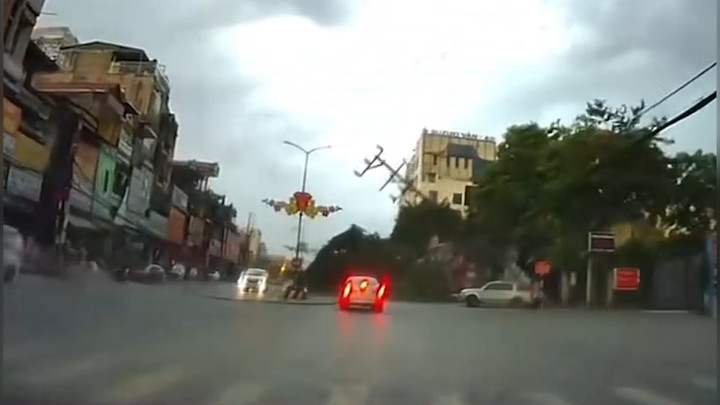 Khoảnh khắc dông lốc quật ngã cây xanh, cột điện trên đường