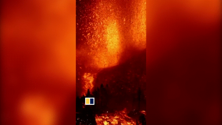 Khoảnh khắc ngọn núi lửa trên đảo La Palma (Tây Ban Nha) phun trào dữ dội được ghi lại bằng shot hình chậm.