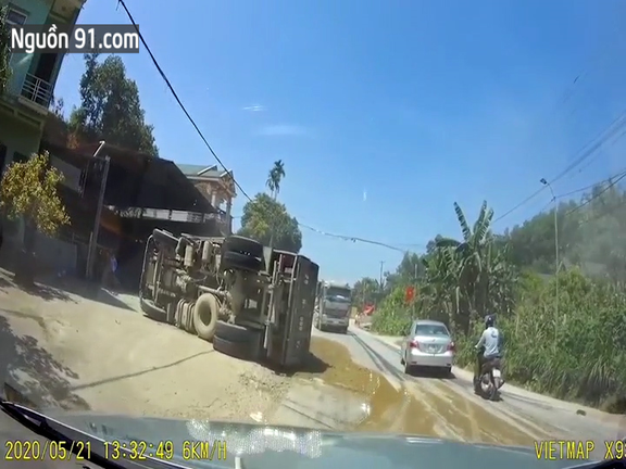 Xe container cố tình vượt ẩu khi qua khúc cua nhưng không quan sát, tài xế xe ben đi ngược chiều đánh lái, sau đó, mất trụ và lật nghiêng.