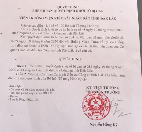 Quyết định khởi tố này được gửi đến Viện Kiểm sát nhân dân tỉnh Đắk Lắk để phê chuẩn.