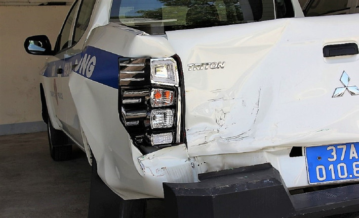 Xe CSGT bị đâm biến dạng góc đuôi (Ảnh: Công an Nghệ An)