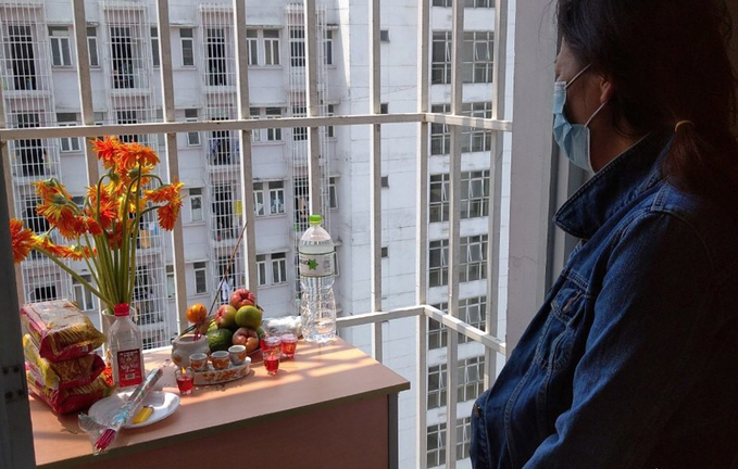 Không về được quê, chị Mai phải lập bàn thờ chồng trong khu cách ly.