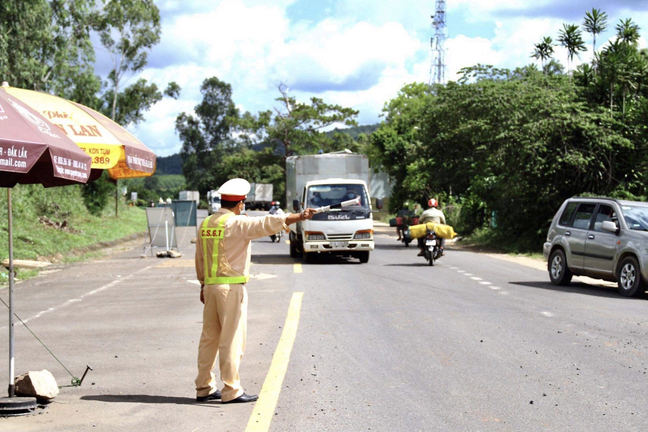 Lực lượng chức năng tỉnh Kon Tum kiểm soát người ra vào địa phương tại khu vực Chốt Sao Mai (TP. Kon Tum).