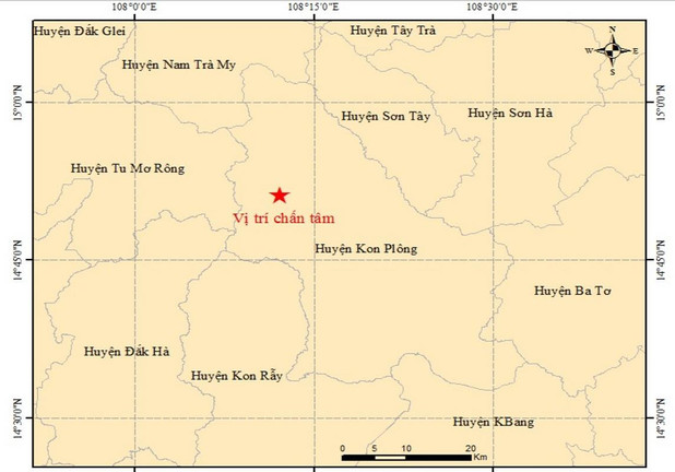 9 giờ 37 phút 41 giây sáng 6/5, một trận động đất mạnh 3,4 độ Richter xảy ra tại khu vực huyện Kon Plông (tỉnh Kon Tum).