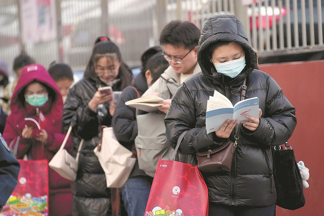 Các thí sinh tranh thủ xem lại tài liệu ôn tập lần cuối trước khi bước vào điểm thi kỳ thi công chức quốc gia tại Thái Nguyên, tỉnh Sơn Tây, Trung Quốc (ngày 26/11/2023). (Ảnh: China News Service)