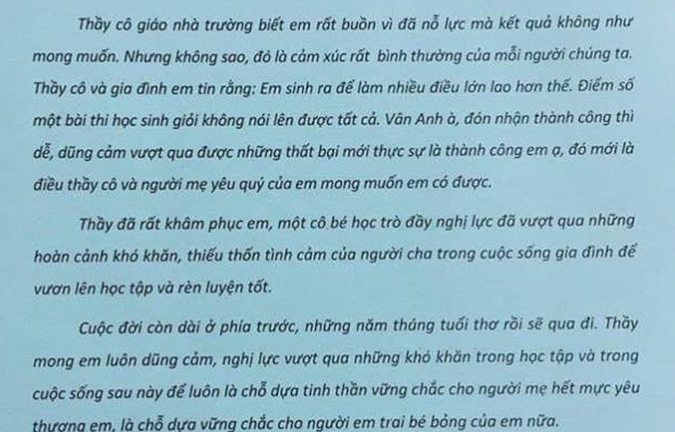 Cuối thư, thầy Hiệu trưởng cũng nhắn nhủ Vân Anh: “Cuộc đời còn dài ở phía trước, những năm tháng tuổi thơ sẽ qua đi. Thầy mong em luôn dũng cảm, nghị lực vượt qua những khó khăn trong học tập và trong cuộc sống sau này để luôn là chỗ dựa tinh thần vững chắc cho người mẹ hết mực yêu thương em, là chỗ dựa vững chắc cho người em trai bé bỏng”.