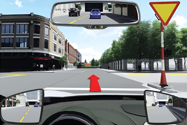 Trước mặt là biển báo giao nhau với đường ưu tiên (được ký hiệu là W.208) nên lái xe phải giảm tốc độ, quan sát nhường đường ưu tiên nếu có và đi qua ngã tư.