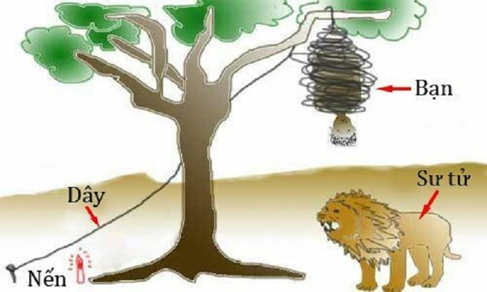 Giả sử bạn bị trói ngược trên cây, ngay phía trên một con sư tử đói; phía dưới chỗ đầu dây được ghim xuống đất là ngọn nến đang cháy.