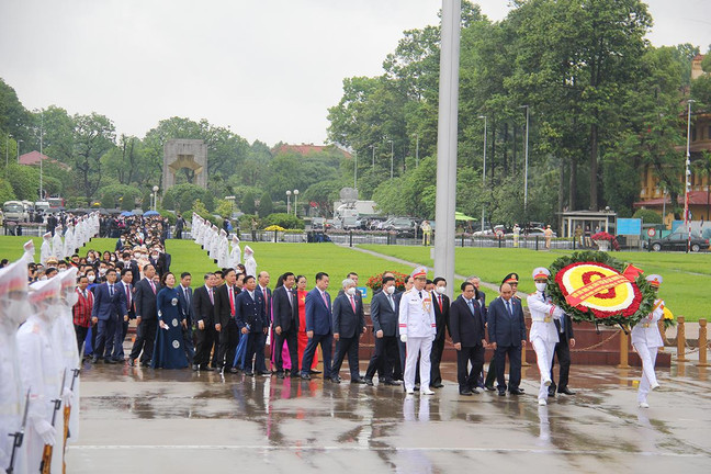 Chủ tịch nước Nguyễn Xuân Phúc, Thủ tướng Chính phủ Phạm Minh Chính, Chủ tịch Quốc hội Vương Đình Huệ dẫn đầu đoàn đại biểu vào Lăng viếng Chủ tịch Hồ Chí Minh.