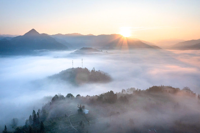 Mây trắng bồng bềnh ôm trọn những dãy núi trùng điệp, tạo nên không gian huyền ảo và lãng mạn.