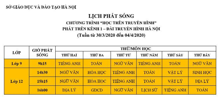 Lịch phát sóng tuần từ ngày 30/3/2020 đến ngày 4/4/2020 Chương trình dạy học trên truyền hình sẽ được phát sóng trên kênh 1, kênh 2 – Đài Phát thanh và Truyền hình Hà Nội.