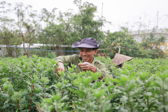 Để hoa cúc nở đúng thời điểm thì có những khi trời tối và mưa rét những nông dân ở làng Dạ Lê Chánh phải mặc áo mưa đi ra vườn để chăm sóc cho cây. (Ảnh: Nguyễn Luân)