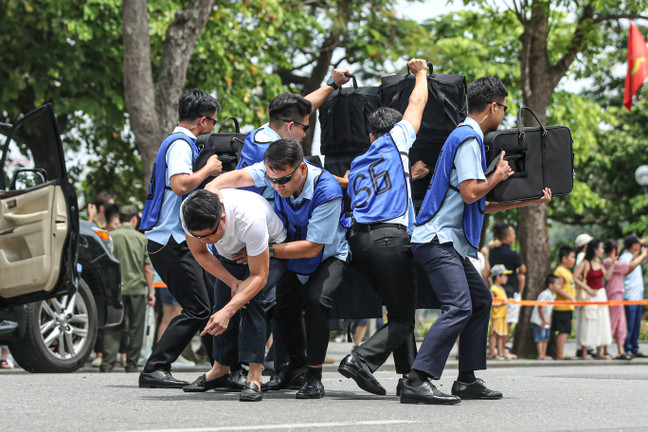 Giữa trung tâm Hà Nội, lực lượng Cảnh vệ diễn tập bảo vệ yếu nhân với tình huống giả định căng thẳng, phản ứng nhanh, trang bị hiện đại, thu hút đông đảo người xem.