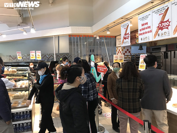 Tại quầy bánh my, mặc dù đã có khuyến cáo nên đứng cách nhau 2 mét khi xếp hàng mua hàng nhưng nhiều người bất chấp lời khuyên từ phía siêu thị vẫn chen lấn để mua được bánh nhanh nhất.