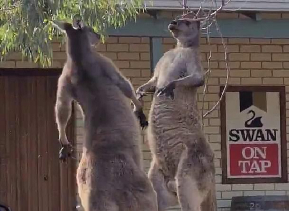 "Hai con kangaroo xám đang đánh nhau bên ngoài Quán rượu John Forres", một người đứng quan sát buổi "đấu võ" chú thích cho video của mình.