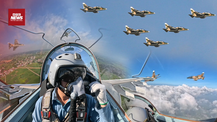 Lần đầu tiên biên đội 6 chiếc Yak-130 bay chào mừng trên bầu trời, kết hợp cùng Su-30MK2 và L-39NG tạo đội hình phản lực hùng tráng.