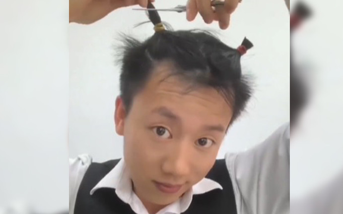 Trông anh chàng rất ngố với những túm tóc buộc trên đỉnh đầu, không ngờ chỉ cần tự cầm kéo xoẹt vài nhát là thành soái ca.