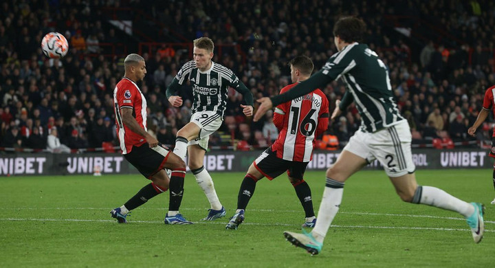 Niềm vui của các cầu thủ đội khách kéo dài được 3 phút thì chính McTominay trở thành tội đồ. Tiền vệ người Scotland để bóng chạm tay trong vòng cấm. Trên chấm 11 mét, Oliver McBurnie đánh bại Onana, quân bình tỷ số 1-1.