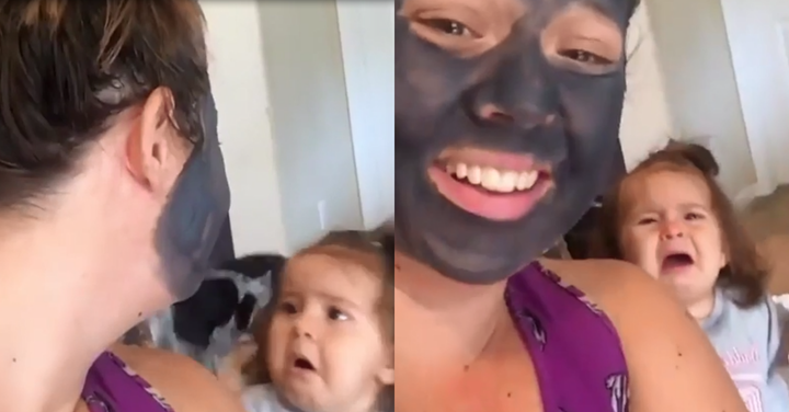 Thấy con khóc vì sợ hãi trước gương mặt đang đắp mặt nạ của mình, các bà mẹ tỏ vẻ thích thú.