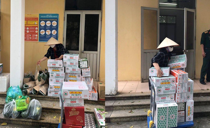Con trai đang cách ly nhưng người mẹ không tiếp tế mà mang hàng chục thùng mì, rau xanh và hoa quả ủng hộ các chiến sĩ, đội ngũ y tế đang công tác tại khu cách ly.