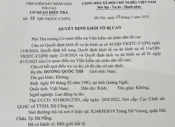 Mới đây, Cơ quan Điều tra Viện Kiểm sát Nhân dân Tối cao có quyết định khởi tố bị can đối với Dương Quốc Thi (SN 1982, quê tỉnh Quảng Ngãi; tạm trú TP Đà Nẵng) về tội "Môi giới hối lộ".