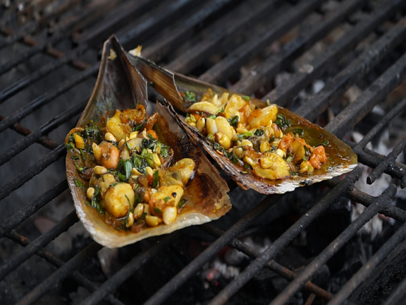 Trong các kiểu chế biến, ngon nhất vẫn là nướng. Phần cồi mai được xắt miếng nhỏ vừa ăn, bày trên vỏ, rưới dầu và hành phi rồi đưa lên vỉ nướng. Tiếng xèo xèo vui tai cùng hương thơm ngào ngạt kích thích vị giác vô cùng.