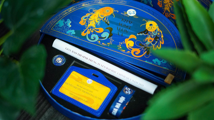 Năm 2025, bộ giấy báo trúng tuyển của trường Khoa học liên ngành và Nghệ thuật, Đại học Quốc gia Hà Nội mang chủ đề "Khát vọng vươn xa". Với hình ảnh cá chép hướng về ánh trăng, bộ giấy báo không chỉ tượng trưng cho những sĩ tử vượt vũ môn, mà còn gợi mở khát vọng chinh phục tri thức, sự bền bỉ trên hành trình học tập, sáng tạo và trưởng thành. (Ảnh: Nhà trường)