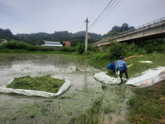 Người dân thu dọn lúa non bị hư hỏng