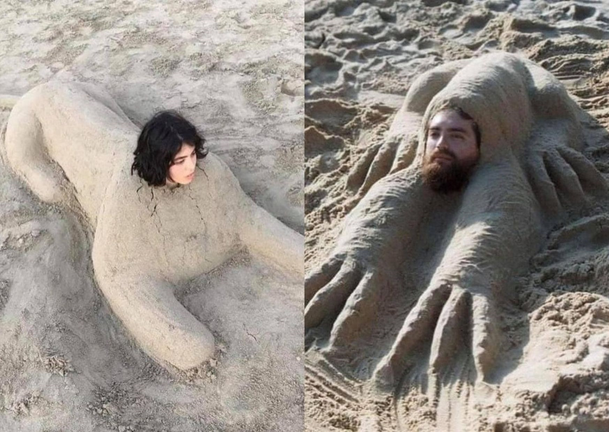 Chỉ lấp cát lên người là xưa rồi, giờ phải sáng tạo thêm hình thù như thế này mới đủ hấp dẫn. (Ảnh: Facebook)
