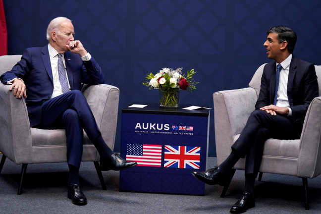 Thủ tướng Anh Rishi Sunak (phải) phát biểu cùng Tổng thống Mỹ Joe Biden trong hội nghị thượng đỉnh AUKUS tại San Diego, California, tháng 3/2023. (Ảnh: AFP)