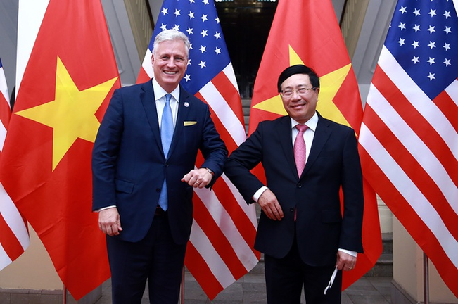 Hôm 15/01, Phó Thủ tướng, Bộ trưởng Ngoại giao Phạm Bình Minh đã có cuộc điện đàm với Cố vấn An ninh quốc gia Mỹ Robert O’Brien. Tại cuộc điện đàm, Phó Thủ tướng, Bộ trưởng Ngoại giao Phạm Bình Minh và Cố vấn An ninh Quốc gia Robert O’Brien hoan nghênh việc hai nước đã linh hoạt tổ chức các hoạt động kỷ niệm 25 năm thiết lập quan hệ ngoại giao bất chấp bối cảnh dịch bệnh COVID-19, đánh giá quan hệ hai nước đang trong giai đoạn phát triển mạnh mẽ, toàn diện trên nhiều lĩnh vực.