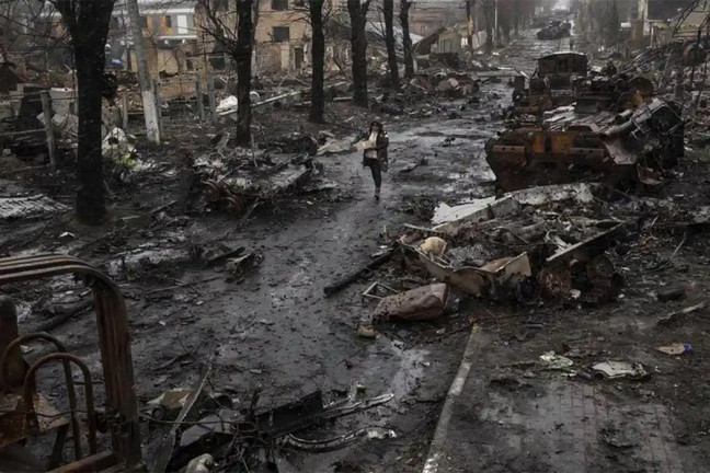Cảnh đổ nát ở thị trấn Bucha, ngoại ô thủ đô Kiev sau một cuộc giao tranh. (Ảnh: AP)