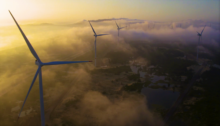 Nhìn từ trên cao, cánh đồng điện gió ven biển Gia Lai với những cánh quạt gió quay đều thoắt ẩn, thoắt hiện trong mây đẹp như một bức tranh.