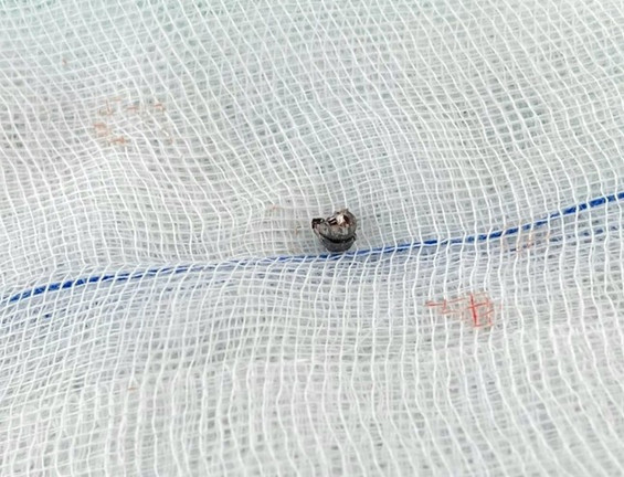Viên đạn chì cắm vào xương sọ bệnh nhi được các bác sĩ phẫu thuật lấy ra ngoài.
