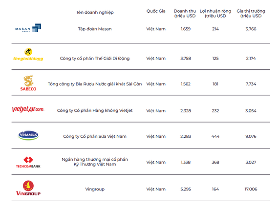 Forbes Asia vừa công bố danh sách 200 công ty có doanh thu trên 1 tỷ USD tốt nhất tại khu vực châu Á - Thái Bình Dương năm 2019. Trong đó, Việt Nam đóng góp 7 cái tên gồm: Masan Group, Thế Giới Di Động (MWG), Sabeco, Vietjet Air, Vinamilk, Techcombank và Vingroup.