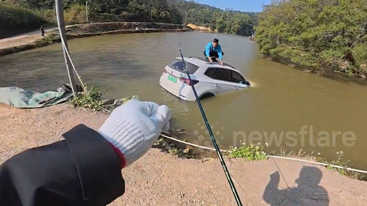 Sau vài phút căng mình kéo cần câu, người câu cá đã giải cứu thành công tài xế ô tô mắc kẹt giữa ao tại Thâm Quyến, Trung Quốc.