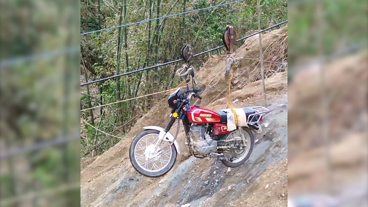 Người dân tỉnh Camarines Norte, Philippines phải dùng ròng rọc để kéo xe máy và hàng hóa qua sông sau khi cây cầu của họ bị gãy trong cơn bão nhiệt đới.