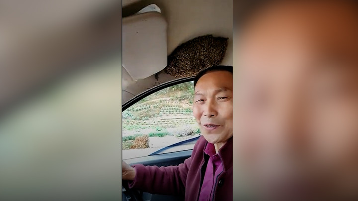 Người đàn ông chở theo đàn ong trong ô tô ở miền đông Trung Quốc, một số con ong còn bay trên đầu người này.